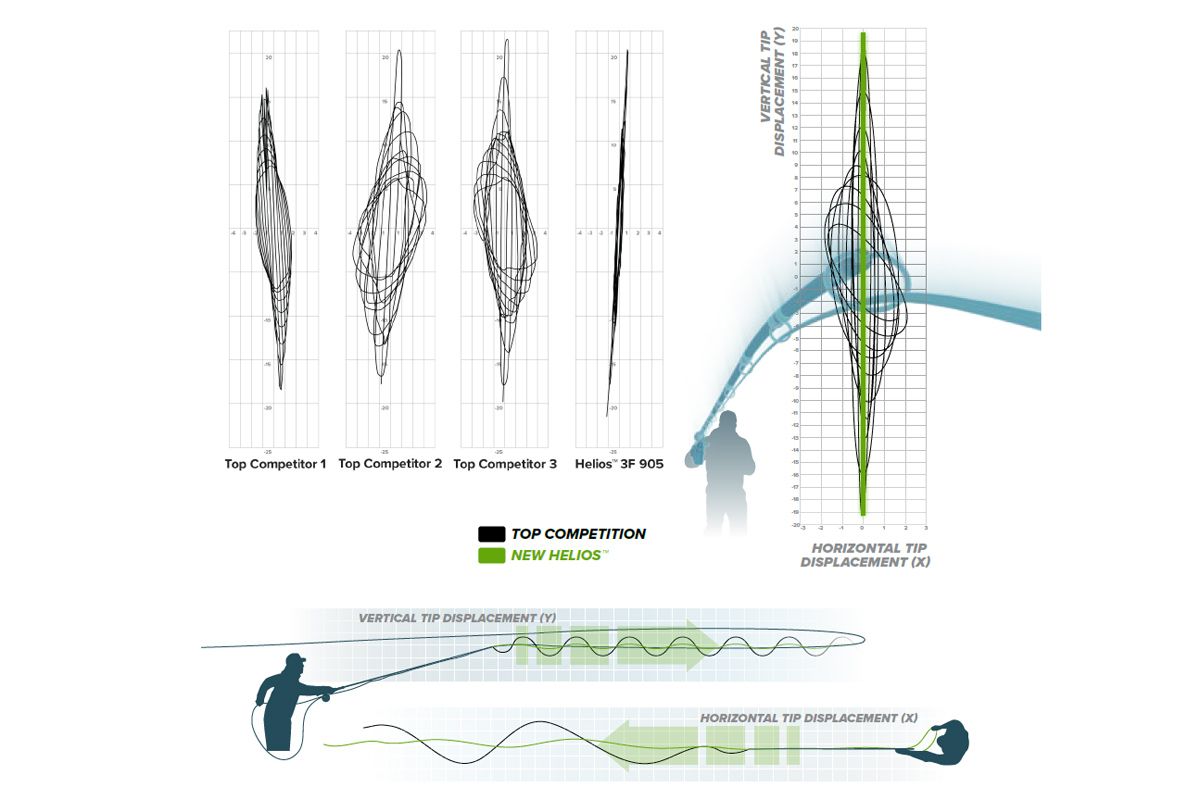 Um diesen Quantensprung in der Genauigkeit zu erreichen, mussten die Designer von ORVIS eines der Hauptprobleme für Präzision lösen: die Spitzenverlagerung [Pendel- und Rotationbewegung der Rutenspitze]. Die neue Helios zeigt eine signifikant erhöhte Materialumfangsfestigkeit und minimierte Vibrationen entlang des Blanks, was zu einer radikalen Reduzierung der Spitzenschwigung führt.